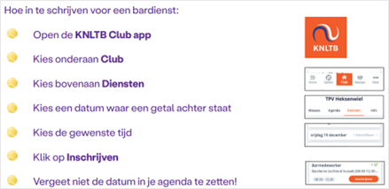 Van 1 november t/m 31 december 2025 staat de bardienstplanning open in de KNLTB clubapp en kun je je inschrijven voor één bardienst in het eerste half jaar van 2026.